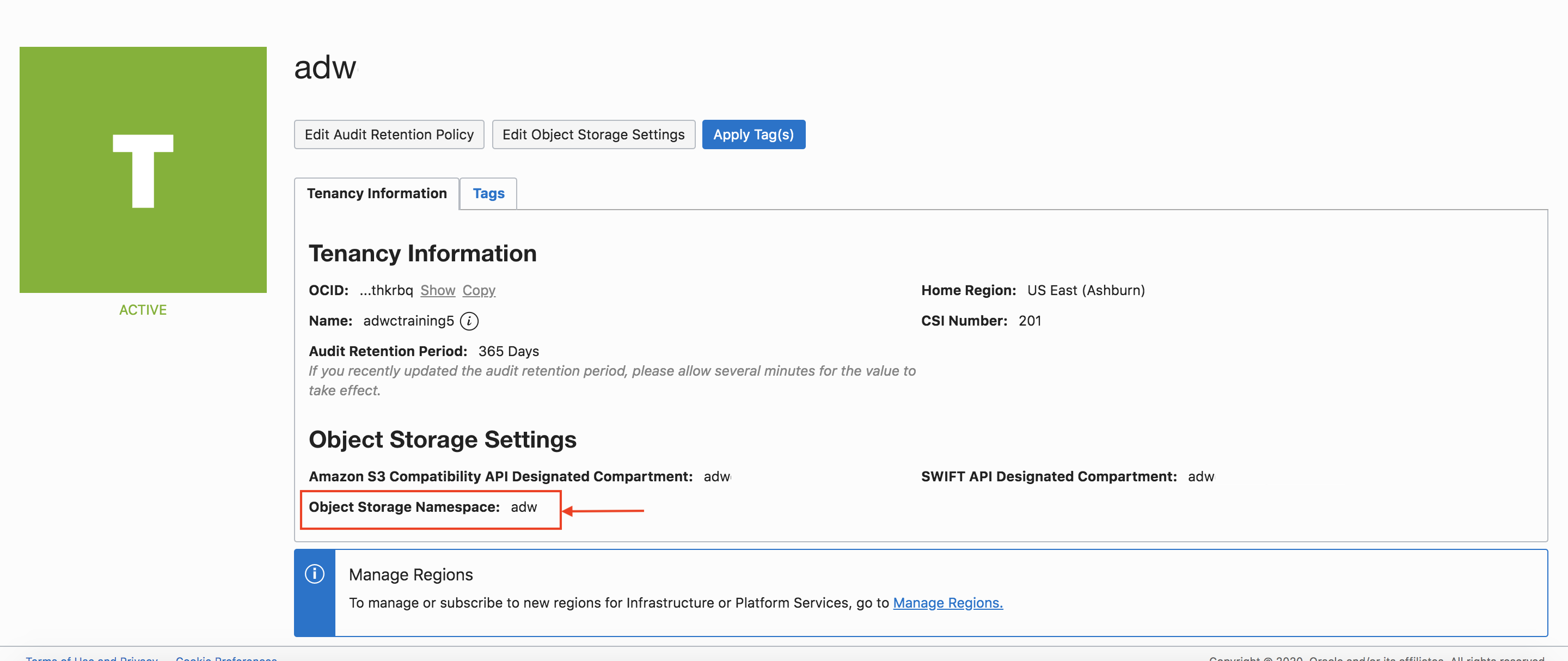- <namespace> with Object Storage namespace. This can be found in Profile -> Tenancy (top right corner of the Oracle Cloud page). Look for your “Object Storage Namespace”, it may be the same as your tenancy name or a different ID.