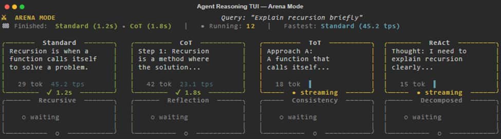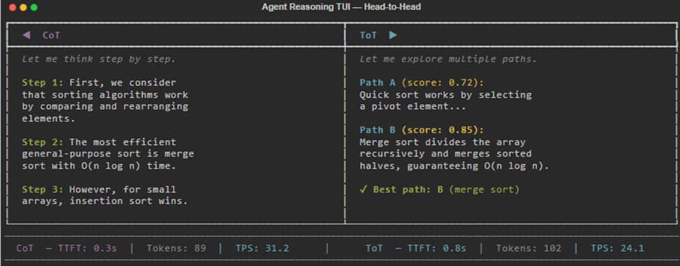 Press v to toggle structured visualization mode. Instead of raw text, you see the agent’s reasoning process rendered live: tree diagrams for ToT, swimlanes for ReAct, vote tallies for Consistency, score gauges for Refinement, and more.