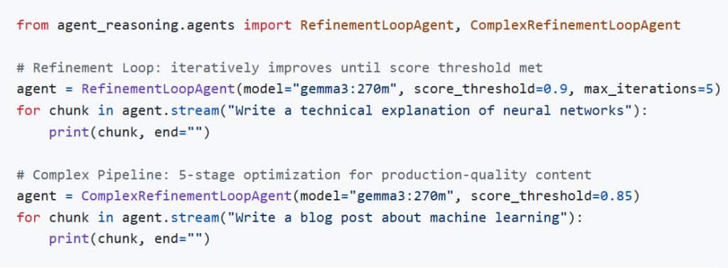 | Refinement Loop | Generator → Critic (0.0-1.0 score) → Refiner iterative loop. | Technical Writing, Quality Content | Inspired by Madaan et al. (2023) |