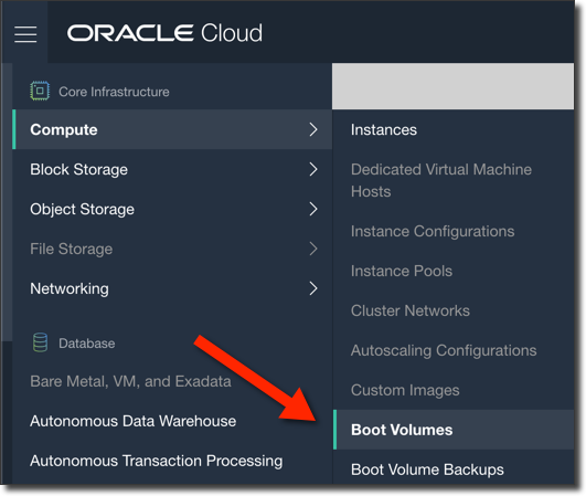 The first thing we should do is create a manual backup of our boot volume so that we have a base to work from going forward and are familiar with the UI and how to manually create one. Log in to your Oracle Cloud account and head to the sidebar menu and select ‘Compute’ -> ‘Boot Volumes’:
