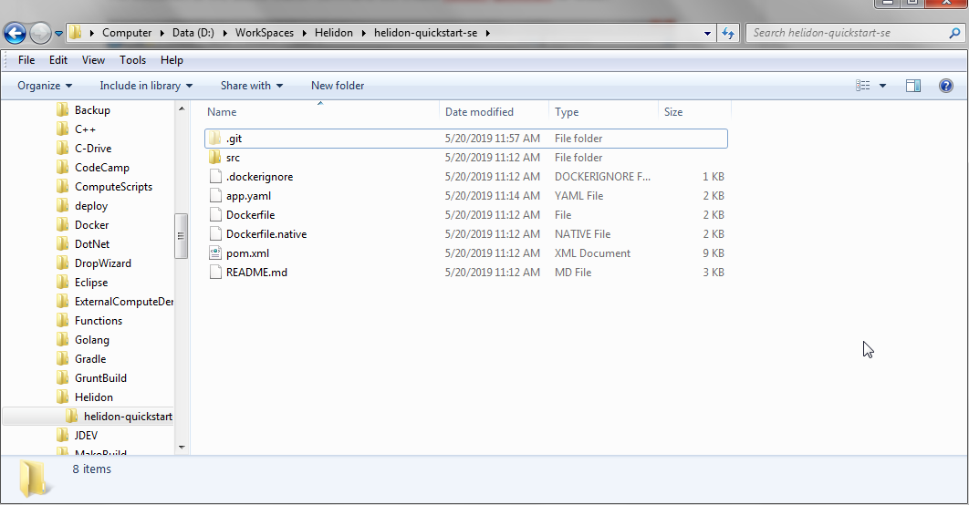 The microservice application code, the build files, and the deployment files all reside in the helidon-quickstart-se folder.