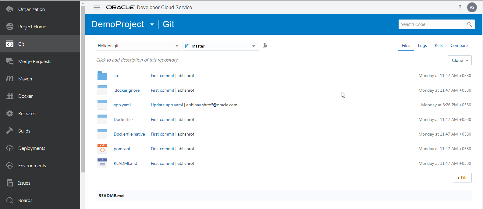 Now let’s create an Oracle Developer Cloud project with a Git repository. We’ll call the Git repository Helidon.git.