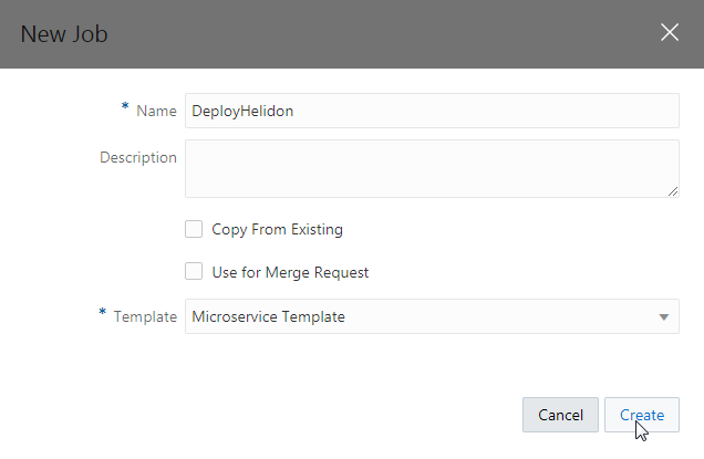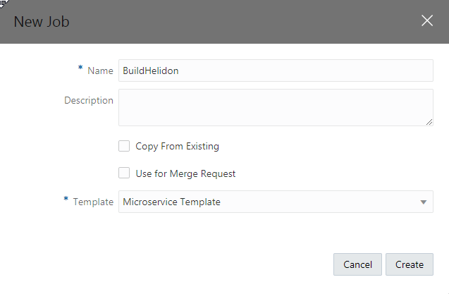 In the New Job dialog, enter BuildHelidon for the Name and select a Template that has the Docker runtime. Then click the Create button. This build job will build Docker image for the Helidon Microservice code in the Git repository and push it to the DockerHub registry.