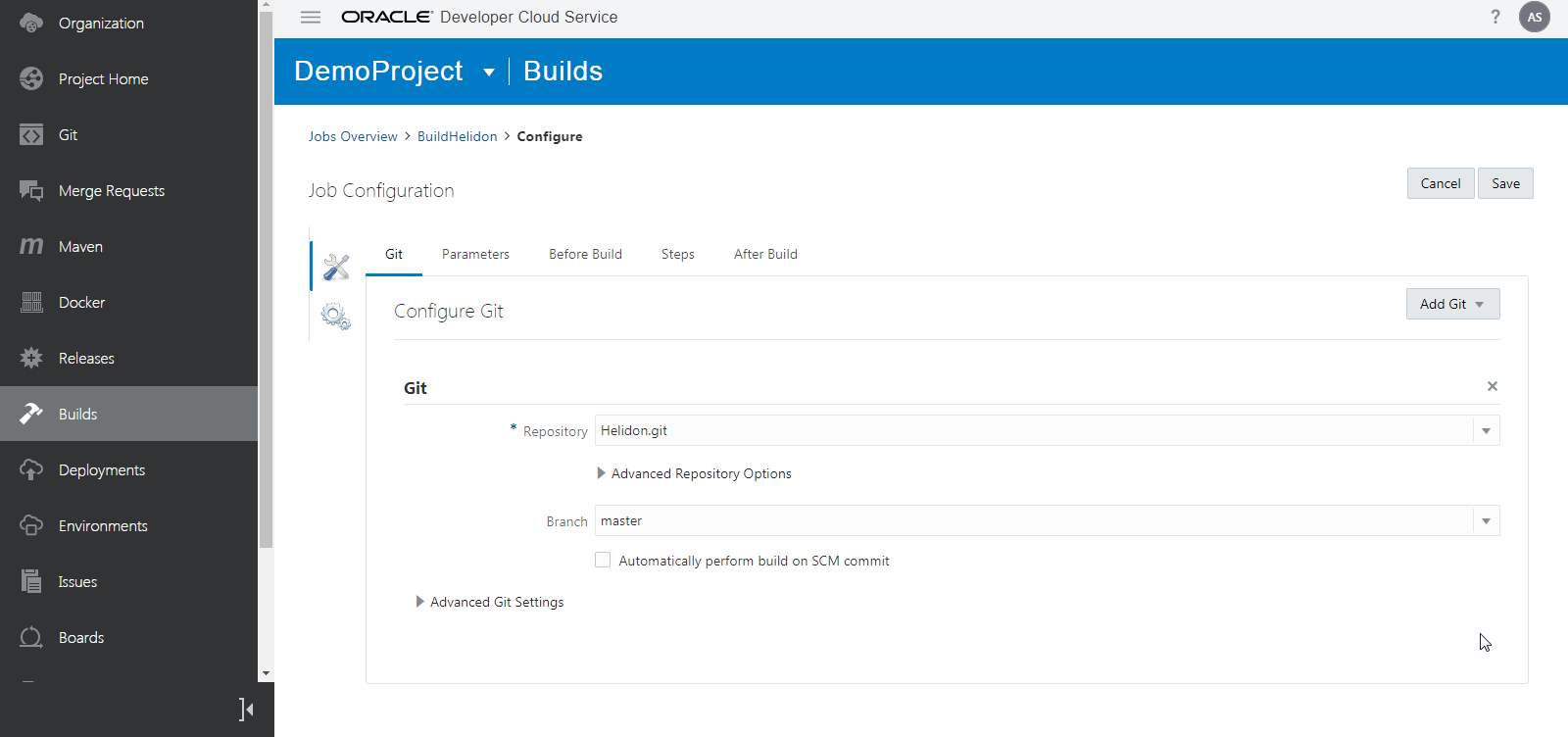 In the Git tab, select Git from the Add Git dropdown, select Helidon.git as the Git repository and, for the branch, select master.