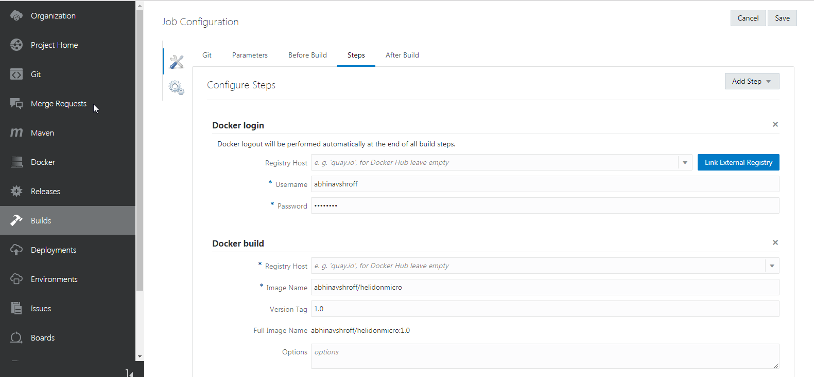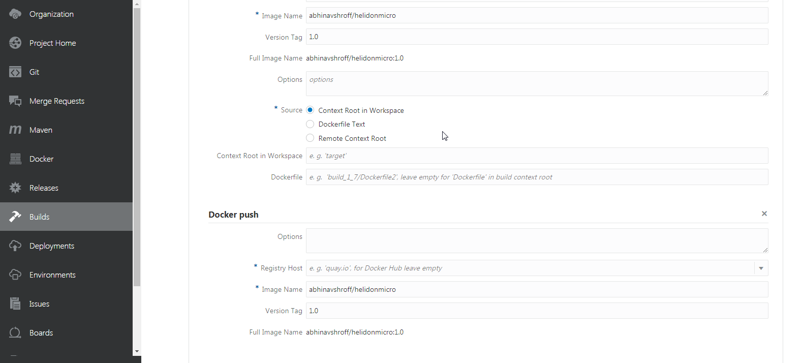In the Docker push step, enter <DockerHub Username>/helidonmicro for the Image Name and 1.0 for the Version Tag. Then click the Save button.