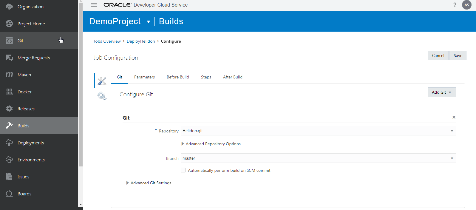The first thing you’ll do to configure the DeployHelidon build job is to specify the repository where the code is found and select the branch where you’ll be working on the files. To do this, in the Git tab, add Git from the dropdown, select Helidon.git as the Git repository and, for the branch, select master.