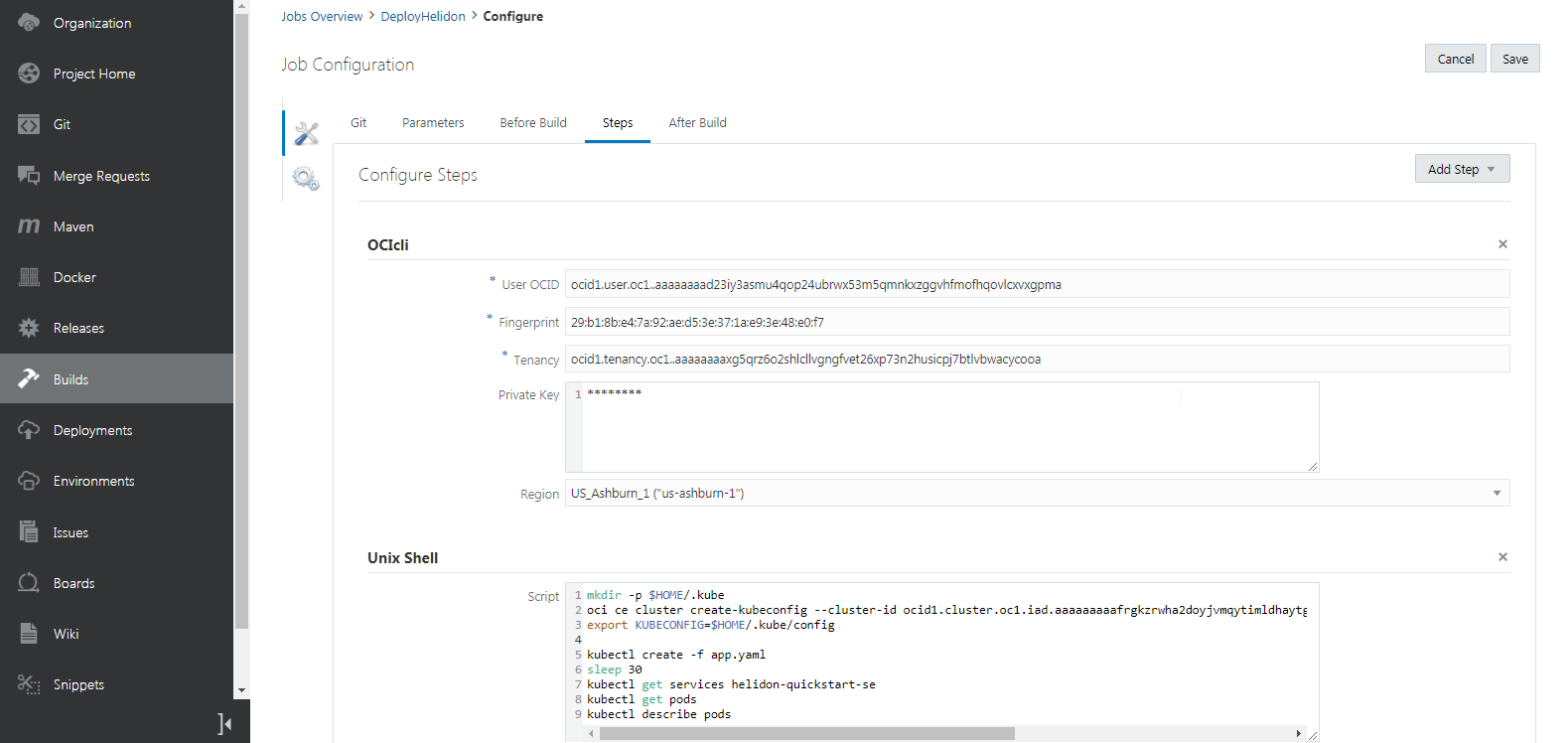 In the Steps tab, select OCIcli and Unix Shell from the Add Step drop down. Take a look at this blog link to see how and where to get the values for the OCIcli configuration. Then, in the Unix Shell build step, enter the following script. You can get the Kubernetes Cluster Id from the Oracle Cloud Infrastructure console.