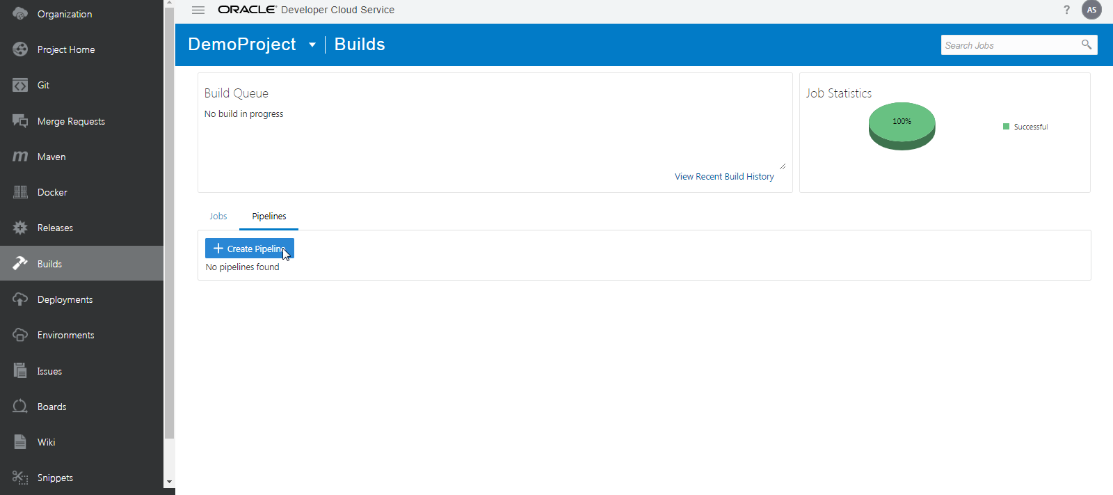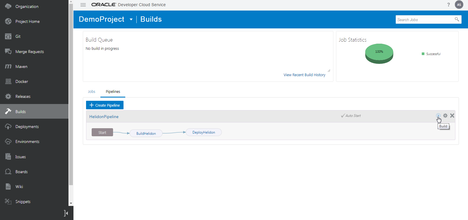 Click the Build button, as shown, to run the build pipeline. The BuildHelidon build job will be executed first and, if it is successful, then the DeployHelidon build job that deploys the container on the Kubernetes cluster on Oracle Cloud will be executed next.