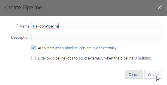In the Create Pipeline dialog, you can enter the Name as HelidonPipeline. Then click the Create button.