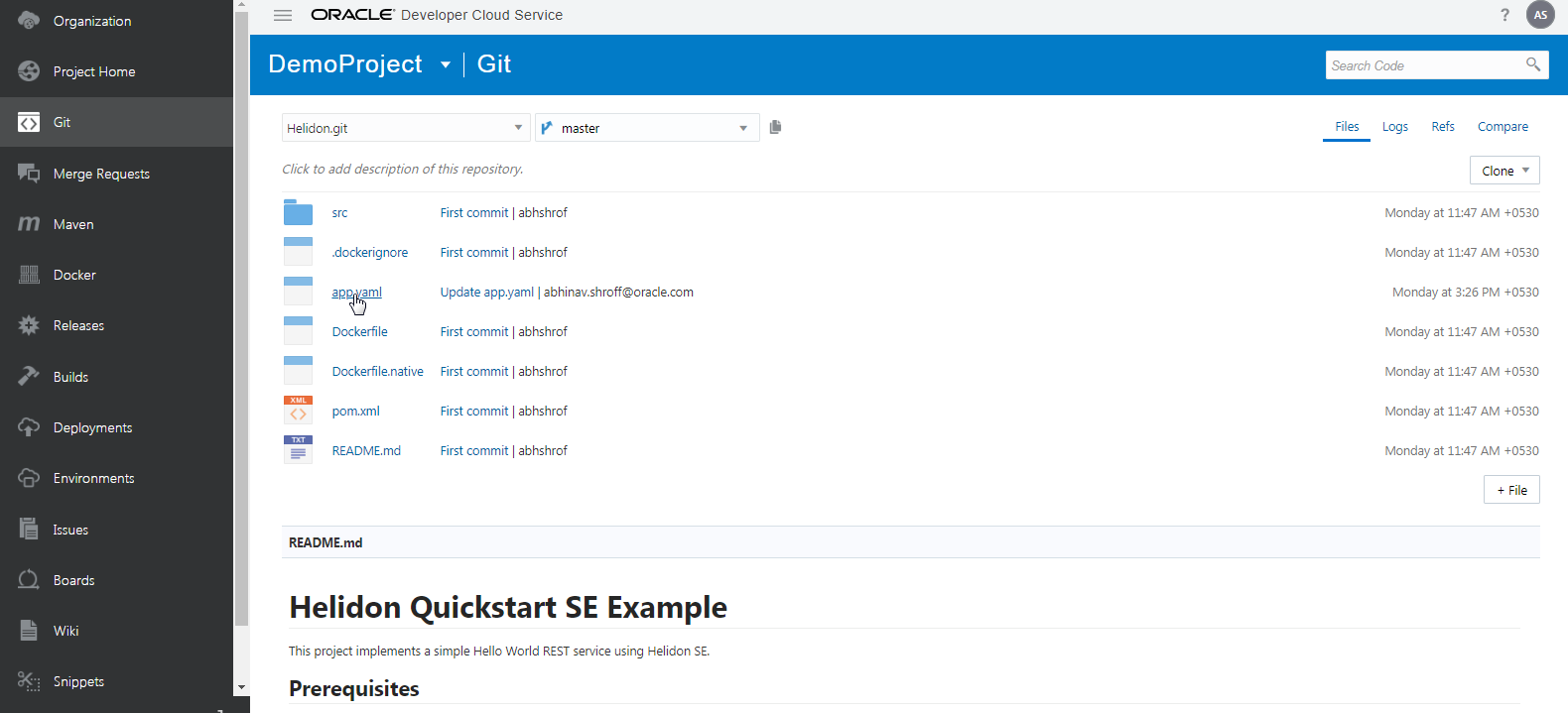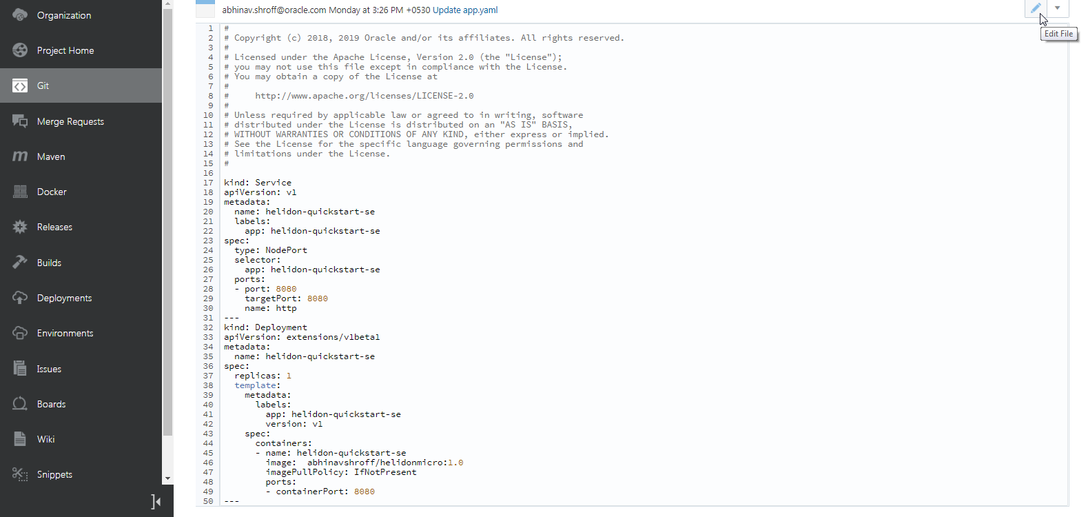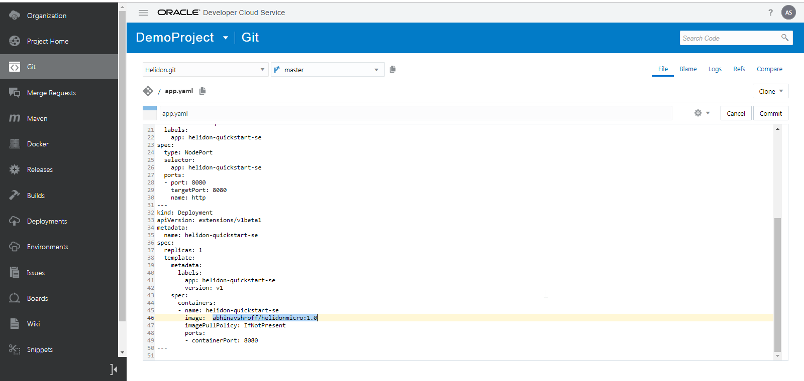 Before we create the build job that will deploy the Helidon Microservice Docker container, you need to edit the app.yaml file and modify the Docker image name. To edit that file, go to the Git page, select the Helidon.git repository, and click the app.yml file link.
