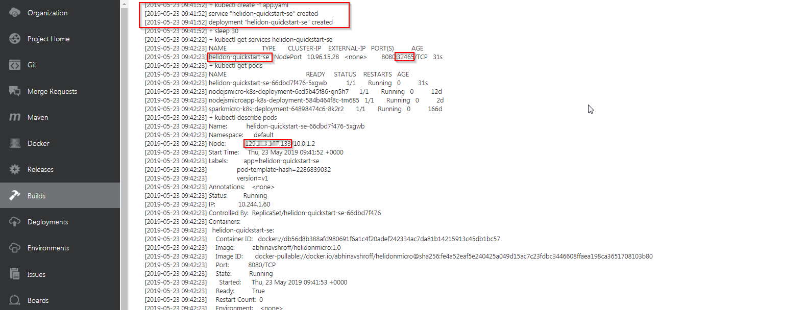 After the jobs in the build pipeline finish executing, navigate to the Jobs tab and click the link for the DeployHelidon build job. Then click the log icon for the executed build. You should see messages that the service and deployment were successfully created. Now, for the helidon-quickstart-se service and deployment that were created on the Kubernetes cluster, search the log, and find the public IP address and port to access the microservice, as shown below.