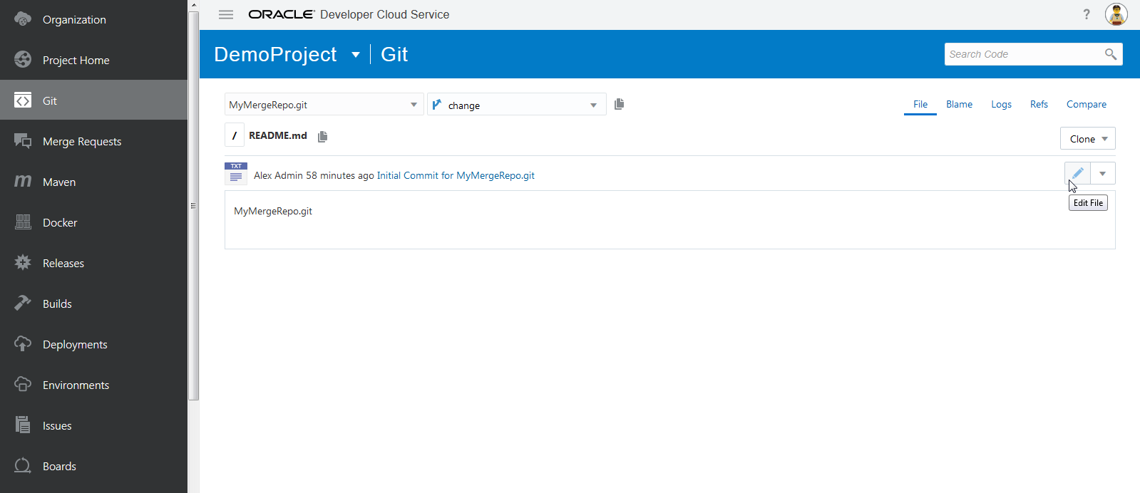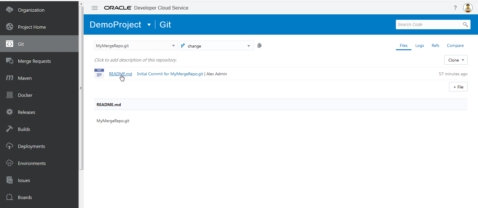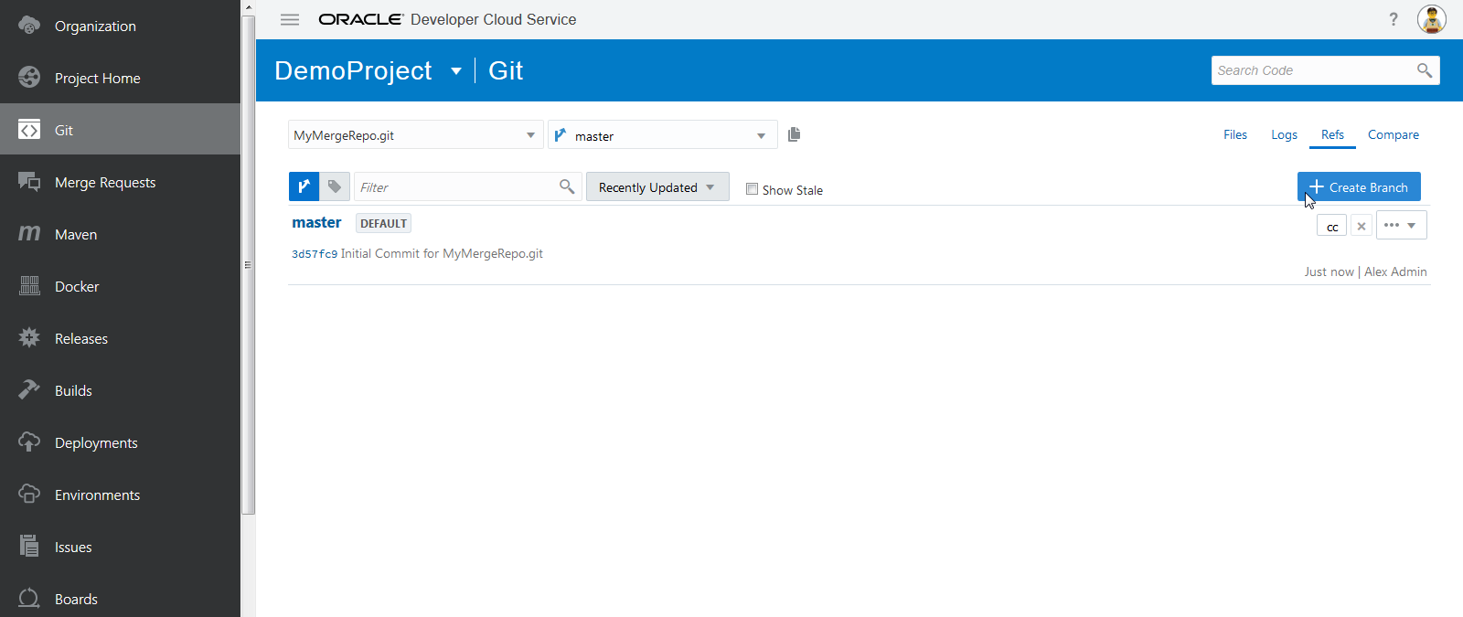 Click Project Home in the navigation bar. In the Project page, select a project to use (I chose DemoProject), and then click the + Create Repository button to create a new repository. I’ll use this repository for the code merge in this blog.