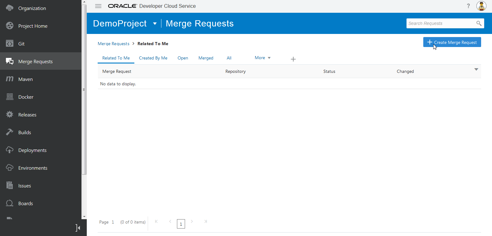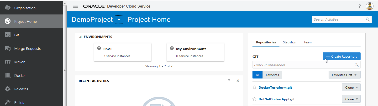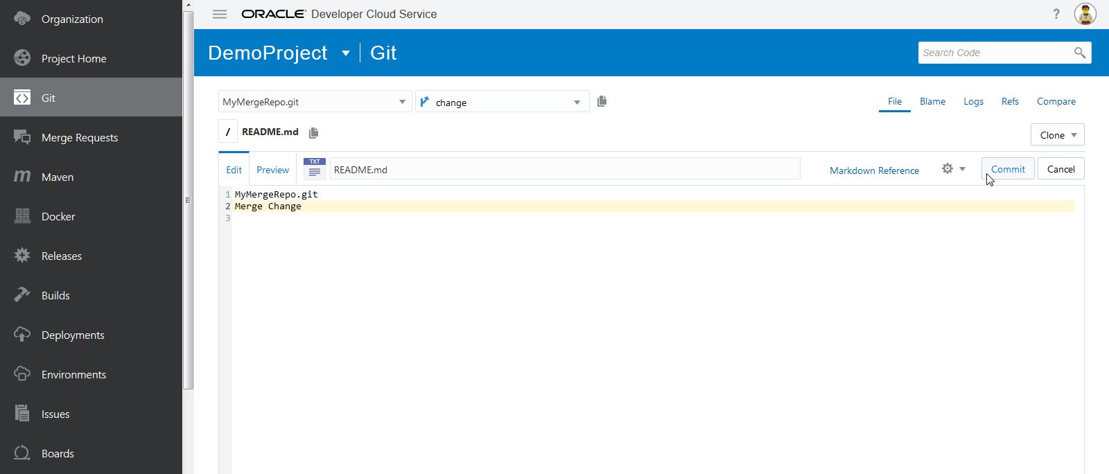 Click Project Home in the navigation bar. In the Project page, select a project to use (I chose DemoProject), and then click the + Create Repository button to create a new repository. I’ll use this repository for the code merge in this blog.