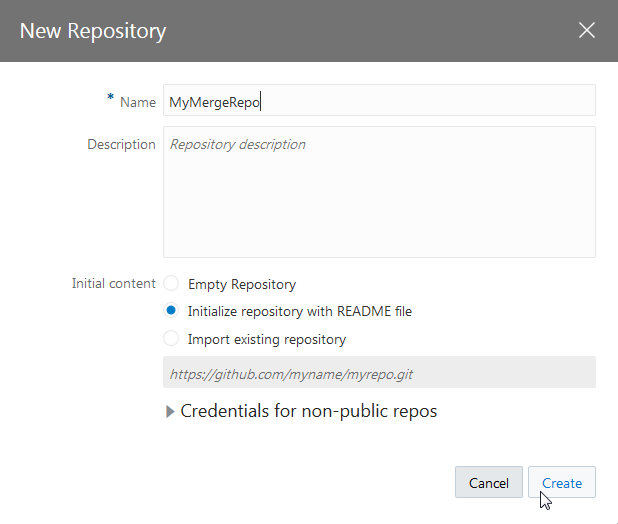 In the New Repository dialog box, enter a name for the repository. I used MyMergeRepo, but you can use whatever name you want. Then, select the Initialize repository with README file option and click the Create button.