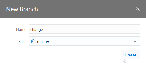 In the New Branch dialog, enter a unique branch name. I used change, but you can use any name you want. Select the appropriate Base branch from the drop-down list. For this repository, master branch is the only option we have. Click the Create button to create the new branch.