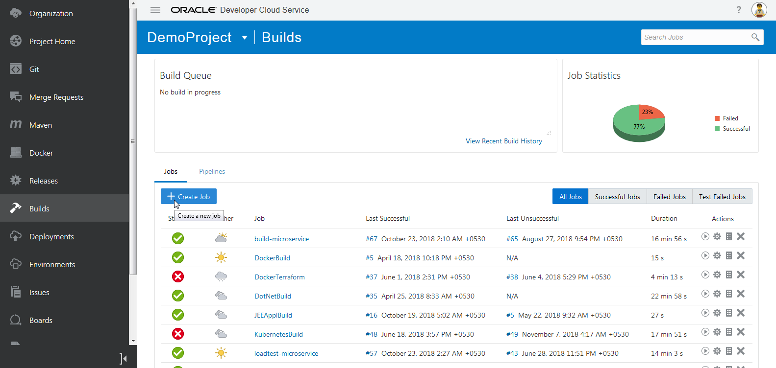 In the navigation bar, click Builds. In the Jobs tab, click on the + Create Job button to create a new build job.