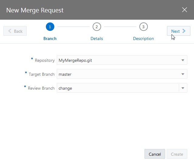 In the New Merge Request wizard, select the Git repository (MyMergeRepo), the target branch (master), and the review branch (change). You won’t see any commits because we haven’t done any yet. Click the Next button to advance to the second page.