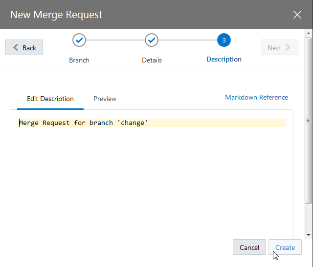 You can change the description for the merge request or just use the default one. Then click the Create button to create the merge request.