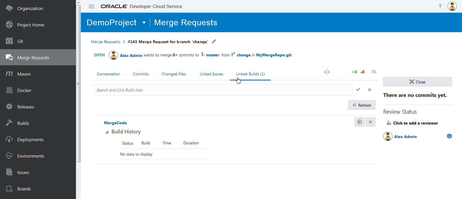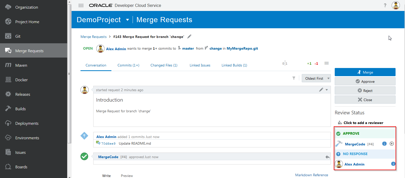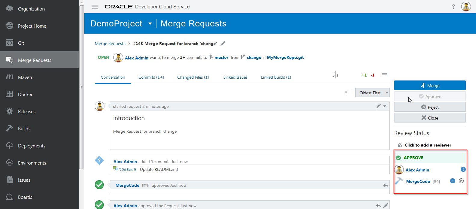 Note: For this merge request, Alex Admin, the user who is logged in, is the reviewer.