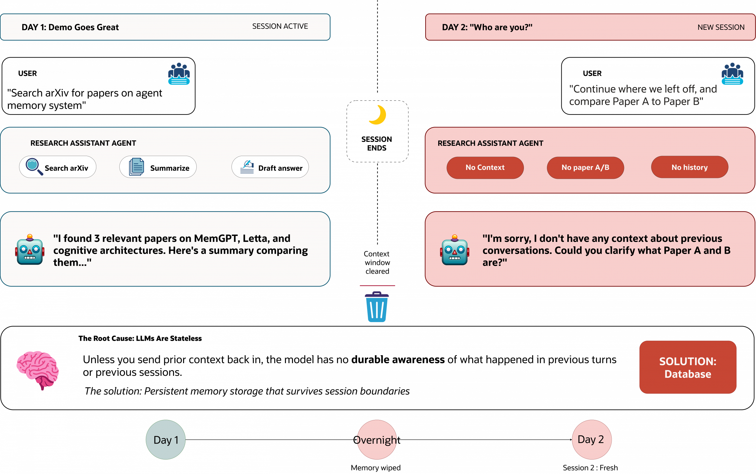 You build a Research Assistant agent that performs brilliantly in a demo; in the current execution, it can search arXiv, summarize papers, and draft a clean answer in a single run. Then you come back the next morning, start from a clean run, and then prompt the agent: “Continue from where we left off, and also compare Paper A to Paper B.” The agent responds as if it has never met you because LLMs are inherently stateless. Unless you send prior context back in, the model has no durable awareness of what happened in previous turns or previous sessions.