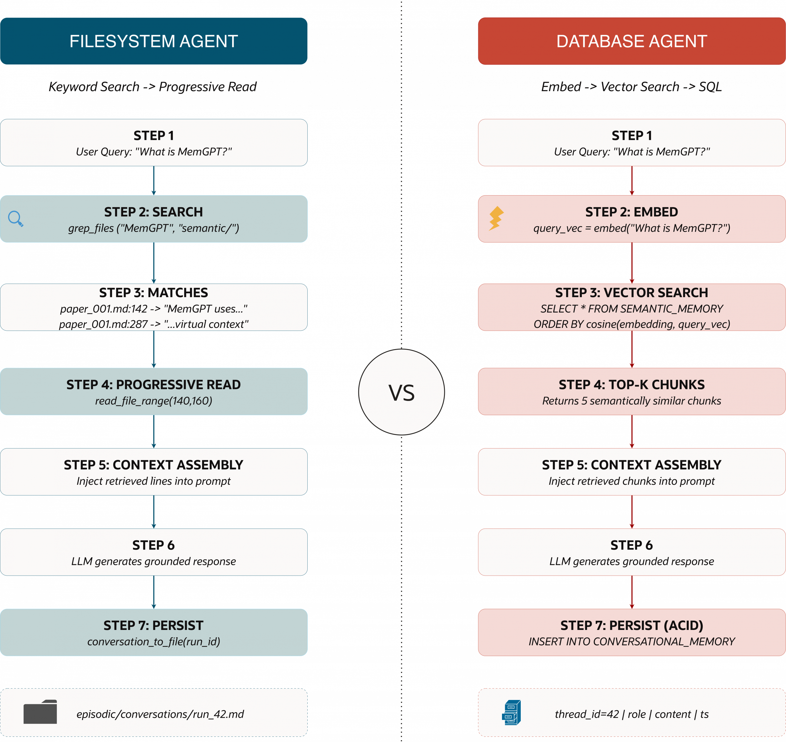 At this point, the difference between a filesystem agent and a database-backed agent should feel less like a philosophical debate and more like an engineering trade-off. Both approaches can “remember” in the sense that they can persist state, retrieve context, and answer follow-up questions. The real test is what happens when you leave the tidy laptop demo and hit production realities: larger corpora, fuzzier queries, and concurrent workloads.