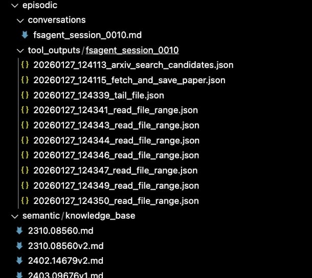 The first memory principle implementation is simple: don’t load large files unless you must. Filesystems are excellent at sequential read/write and work naturally with tools like grep and log-style access. This makes them a strong fit for append-only transcript and artifact storage.