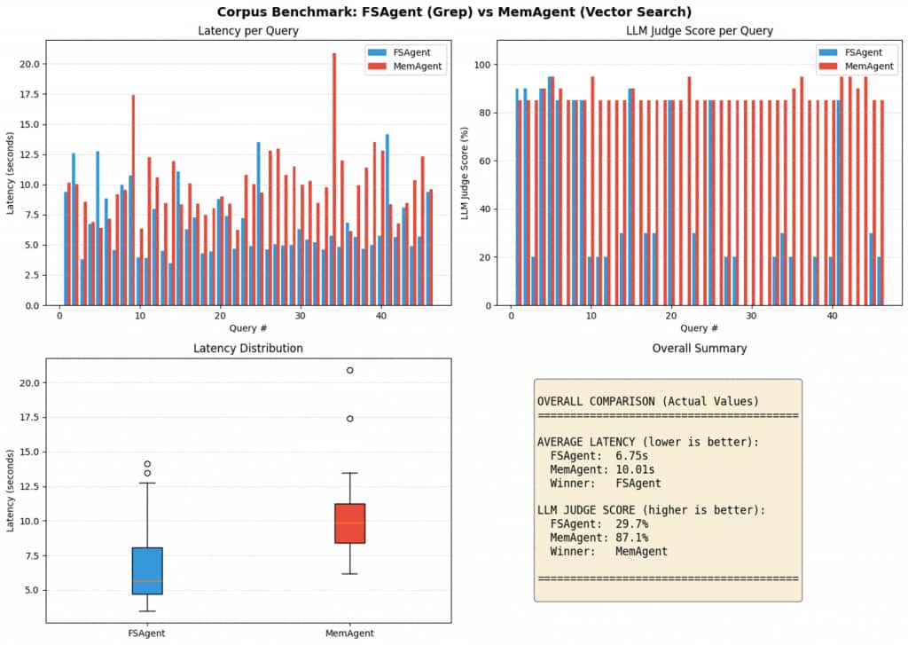 In our run, MemAgent generally finished faster end-to-end than FSAgent. That might sound counterintuitive if you assume “database equals overhead,” and sometimes it does.