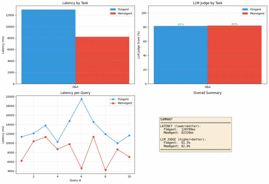 Result Comparison: FSAgent vs MemAgent: End-to-End Benchmark (Latency + Quality)