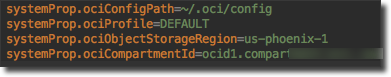The next step is to create some system properties that we’ll need for authentication and some of our service calls.  To do this, you’ll need to set up some config files locally and generate some key pairs, which can be mildly annoying at first, but once you’re set up you’re good to go in the future and you get the added bonus of being set up for the OCI CLI if you want to use it later on.  Once I had the config file and keys generated, I set my props into a file in the app root called ‘gradle.properties’.  Using this properties file and the key naming convention shown below Gradle makes the variables available within your build script as system properties.