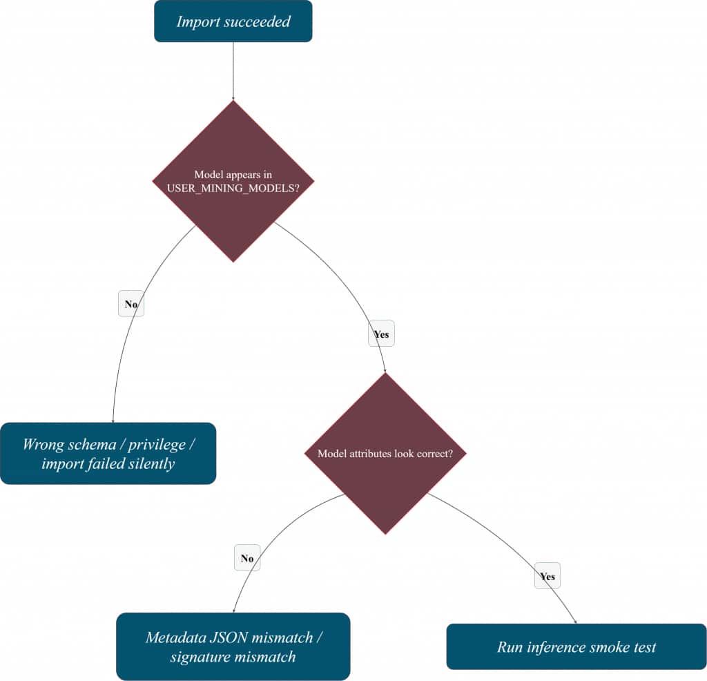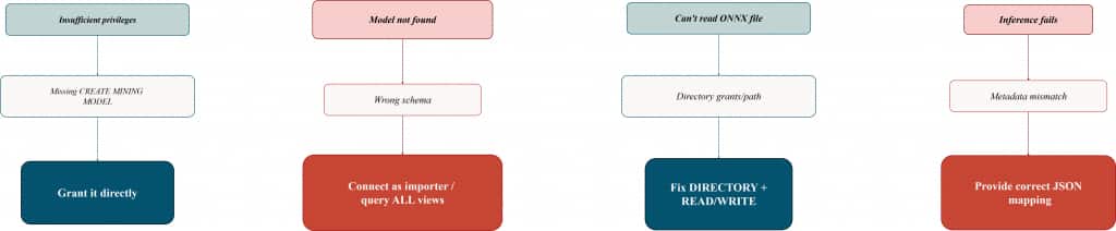 • Most “model import failures” are actually privilege or access issues (roles, grants, directory permissions, or wrong schema).