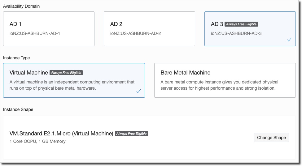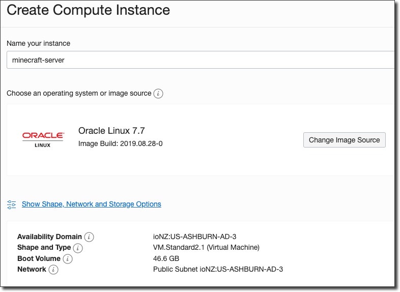 Next, enter a name for your VM and then click ‘Show Shape, Network and Storage Options’ and then make sure that you pick the ‘always free’ shape: