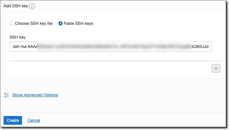 After you have generated your SSH key pair, keep both of these files to somewhere safe on your computer. I named my two files as ‘minecraft_private_key.txt’ and ‘minecraft_public_key.txt’. Next, open up the public key text file and copy the contents of that. Now, back in the Oracle Cloud console, paste this text in the box that says ‘SSH key’. You can instead select ‘Choose SSH key file’ and upload the public key file if you want to. After you have selected or pasted your public key file, click ‘Create’: