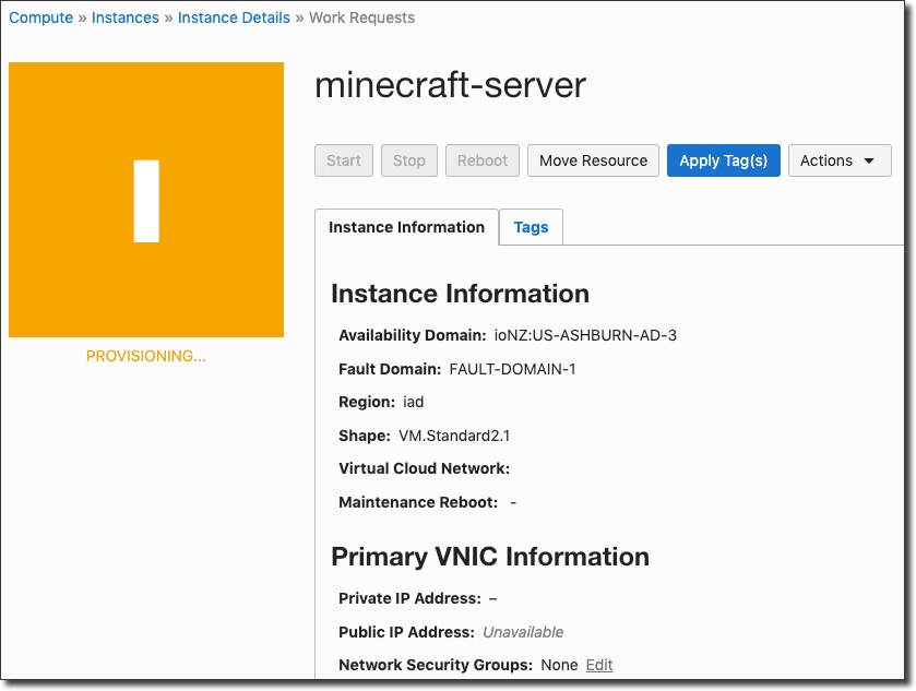 At first your instance will be in ‘Provisioning’ state and the screen will look like this: