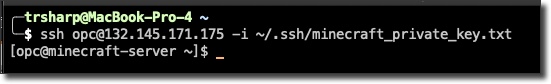 If you are using a Mac or a Linux machine, you can use a command line like ‘Terminal’ to connect up to your server. If you’re using Windows, you’ll have to use a tool like ‘Putty’ to connect to the server. Whichever you use, connect up to the server using the IP address and the private SSH key that you downloaded earlier. The default username for this server is “opc” (it stands for “Oracle Public Cloud” if you were wondering). Here’s how I did that: