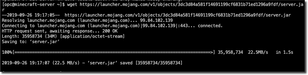 Now we need to download the Minecraft server software. You can get that from https://www.minecraft.net/en-us/download/server and an easy way to download that in Linux is called ‘wget‘ . Copy the link to the server download from the download page and then run this on the server: