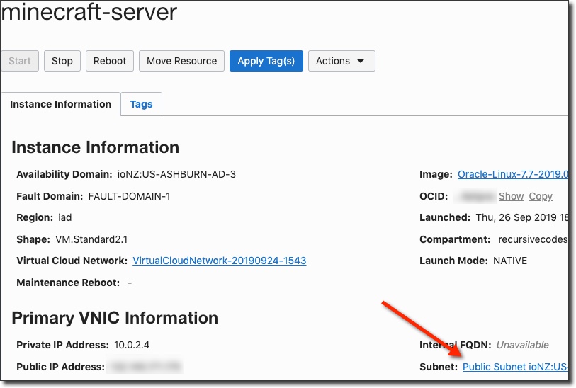 You’re almost ready to use your new Minecraft server, but you’ll need to open up a port in the security list in your server’s network first. On the VM details page, click on the ‘subnet’ link: