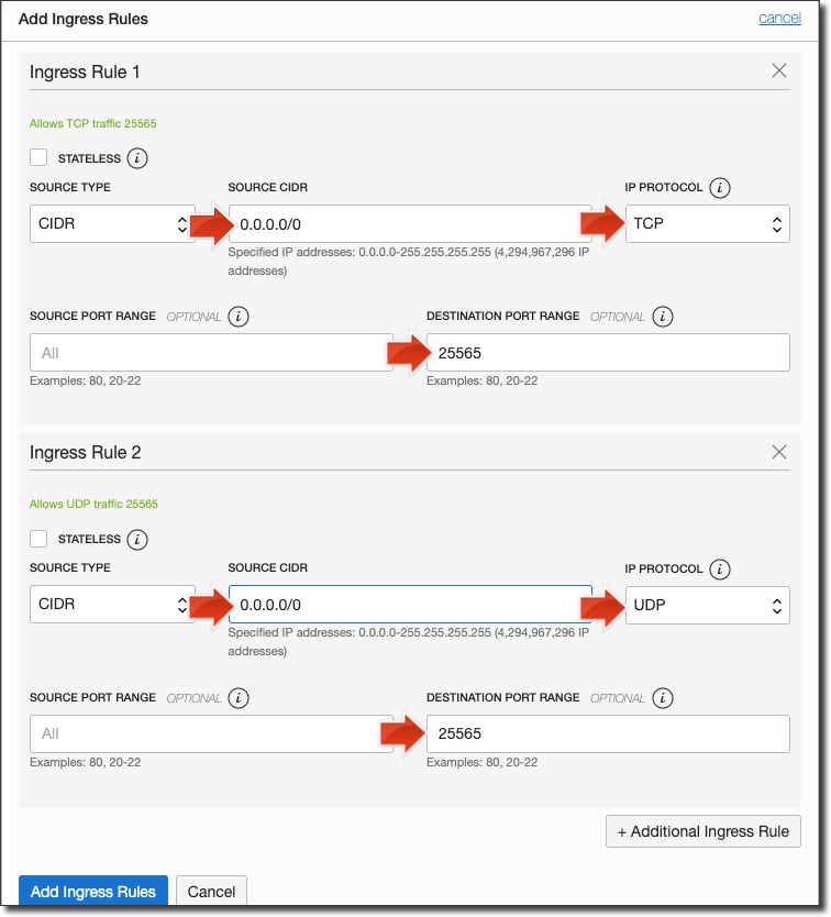 In the Ingress Rules dialog window, create 2 rules and enter the values shown here: