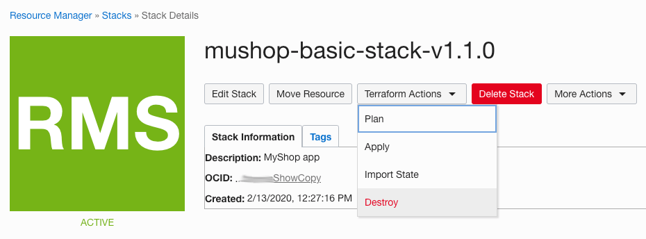 3. In the Stack Details, click on Terraform Actions > Destroy and confirm the destroy job