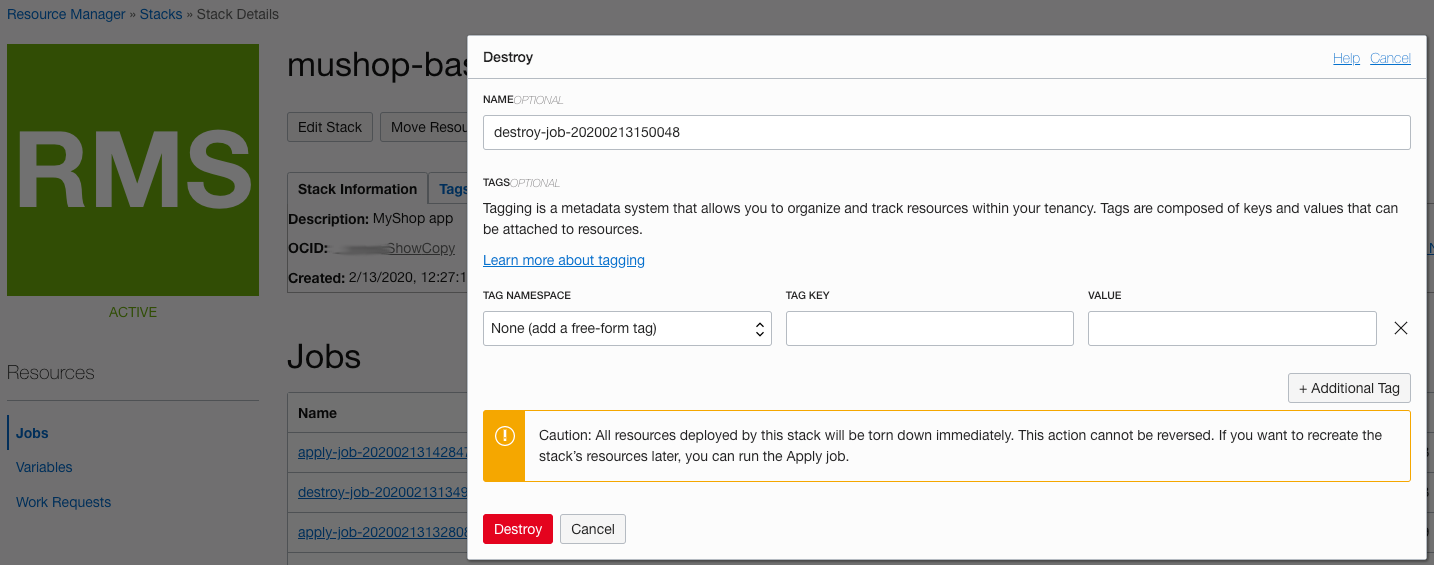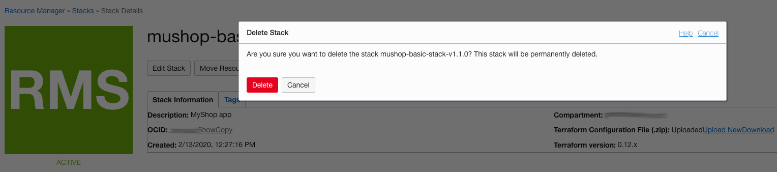 1. Once the destroy job has succeeded, delete the Stack via the Delete Stack button and confirm