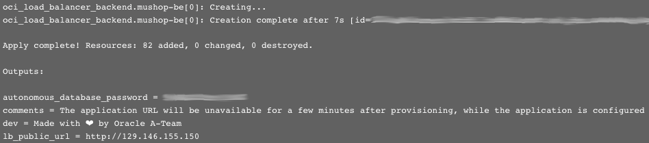 That’s it! All the cloud resources and the MuShop app will be automatically created and deployed which may take a couple of minutes. The public HTTP URL to the app will be displayed as lb_public_url at the very end of the Terraform script output and you can also retrieve it in the Outputs pane later on.