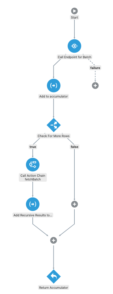 As the title of the article mentioned, the process of making multiple calls to the endpoint to get all the rows will be managed through recursion, e.g. I’ll have an action chain that will call itself, essentially looping until all the rows (or some max number of rows) have been obtained. So the first part of this will be to define the API for that Action Chain in terms of the inputs to it and the data that it will return.