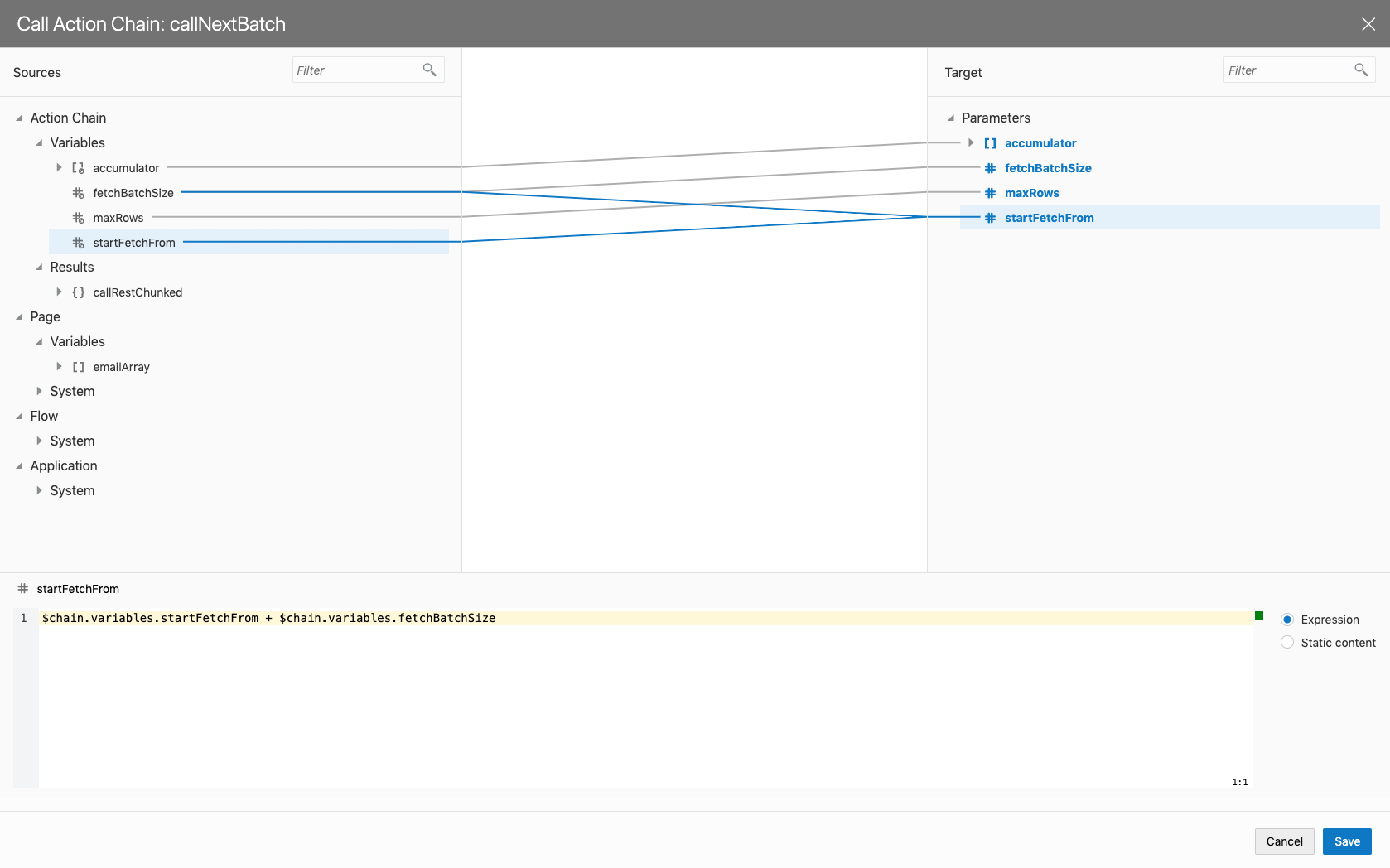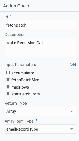 So I create a new Action Chain called fetchBatch and define input parameters and a return type as follows: