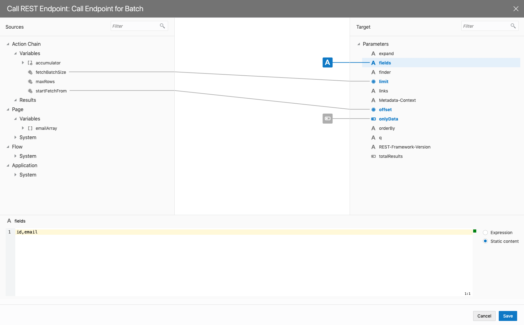 You can see here that the fetchBatchSize and the startFetchFrom input parameters are mapped to the limit and offset parameters on the REST call. In this case I’ve also set onlyData (to true) and the fields that I want in the return payload to optimize things a little, but that’s optional.