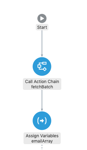 Recursively calling the Action Chain will of course result in additional rows being added to the accumulator, so on our way back up the recursion stack we need to pick up that update. So we drop another Assign Variables action in after the Call Action Chain and re-assign the output of the recursive call back to the accumulator.