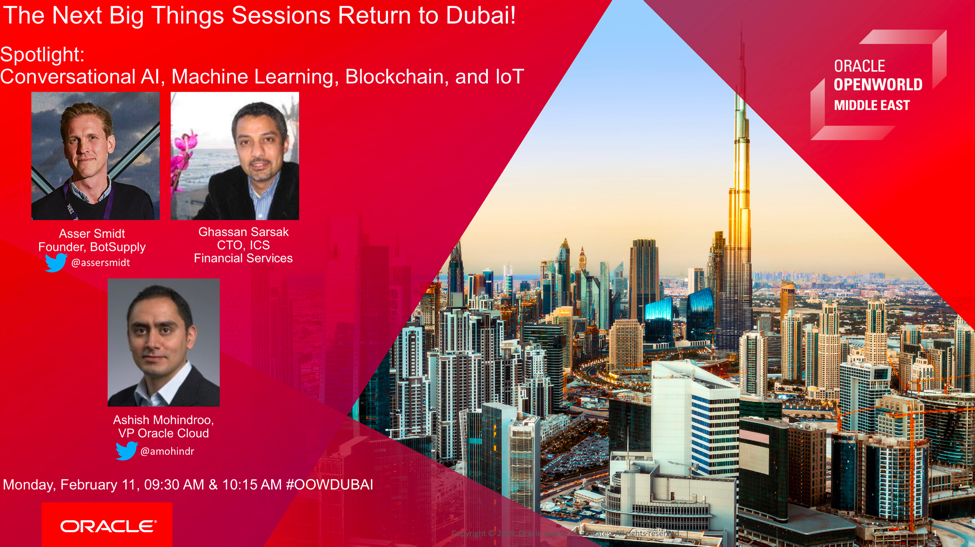 Ashish Mohindroo, VP of Oracle Cloud will be keynoting the Next Big Things session again and this time at the Oracle Open World in Dubai next week. He will be accompanied by Asser Smidt, Founder of BotSupply (an Oracle Global Startup Ecosystem Partner). BotSupply assists companies with conversational bots, have an award-winning multi-lingual NLP and are also a leader in conversational design.