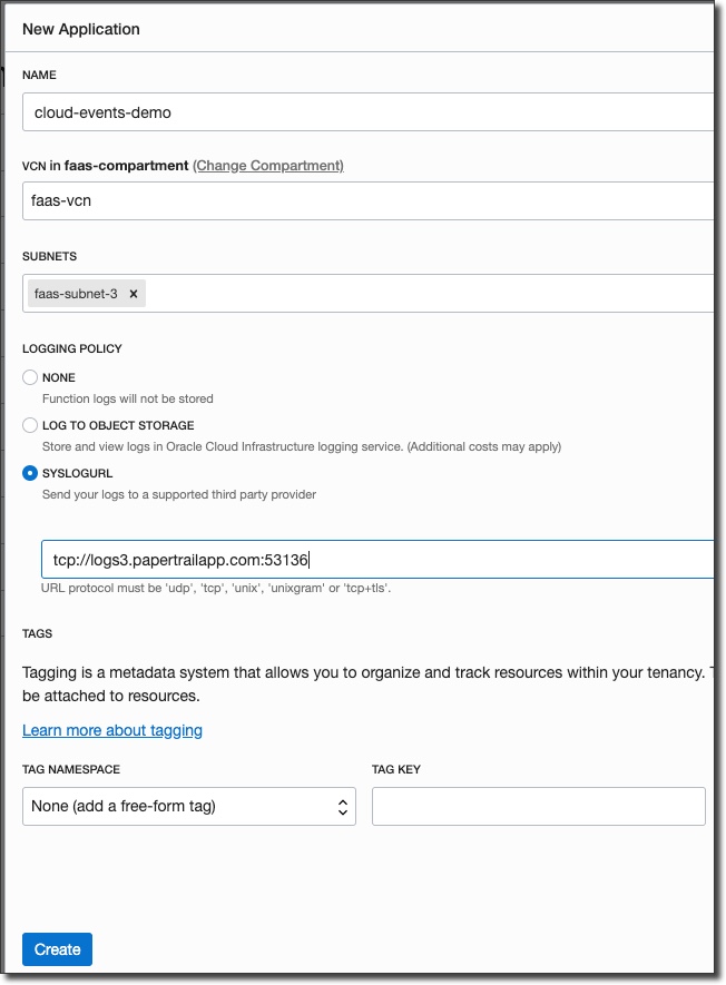 Next, click ‘Create Application’ and then populate the form on the next page. Note, your previously created VCNs are listed here and you can select the appropriate subnet instead of manually providing the OCID of the subnet via the Fn CLI: