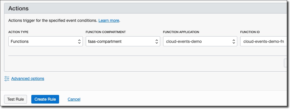 Here we are able to specify the action we would like taken when this cloud event is fired. In this case, we want to call our serverless function, but we could also publish to an Oracle Stream or invoke a notification. Click ‘Create Rule’ and the rule will be immediately available for use.