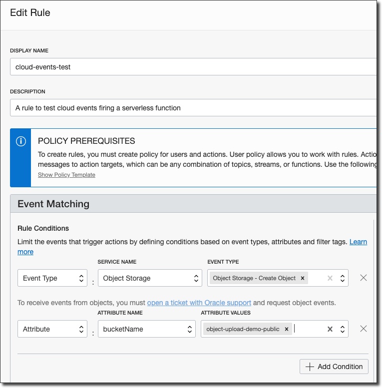 Note the conditions above. I’ve selected ‘Object Storage’ as the ‘Service Name’ and ‘Object Storage – Create Object’ as the ‘Event Type’. I’m also able to filter the events by attributes – in this case, I’m only interested in uploads to my specific bucket. There are a number of event types and filter possibilities that you can choose from. Refer to the service documentation for more information on the event types and filters. The rest of the form looks like this: