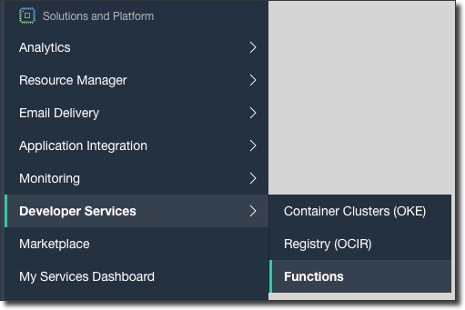 Let’s start by creating a brand new serverless application that we can use for our function. In my previous posts, we created the application via the Fn CLI, so this time let’s use the cloud dashboard instead.  Start by selecting Developer Services -> Functions in the sidebar menu.