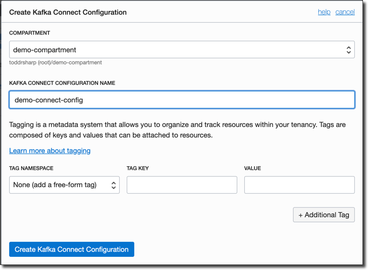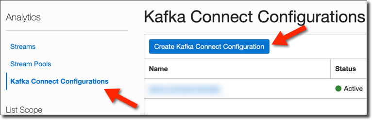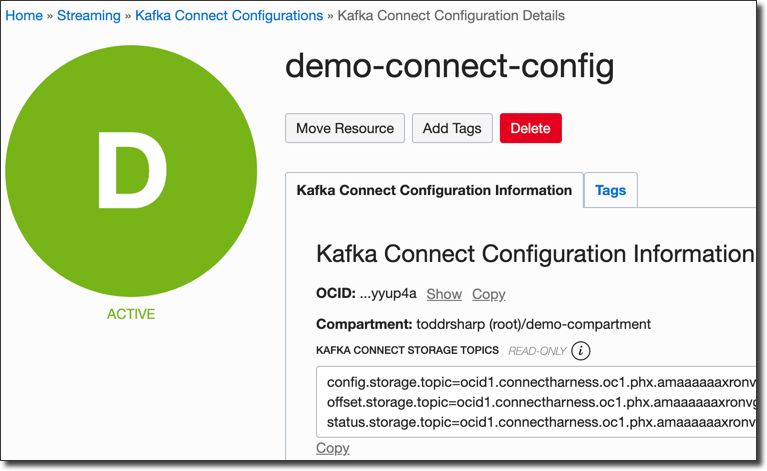 Once it’s created, copy down the Connect configuration OCID as well as the Kafka Connect Storage Topics.